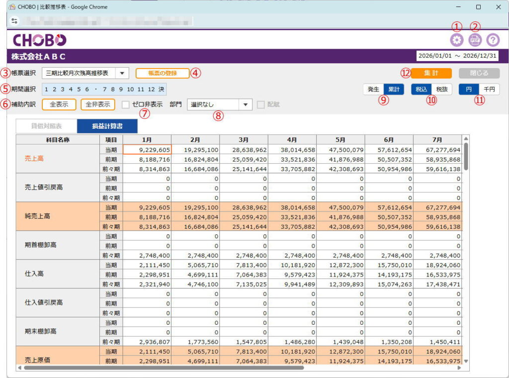 | ⑤期間選択 | 自由に選択できます。 設定変更は「⑫集計」クリック後に反映します。 |