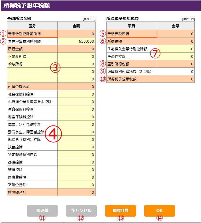 | ⑩所得税予想年税額 | 「⑧差引所得税額」+「⑨復興所得税額(2.1%)」で計算した額がセットされます。「⑭OK」で画面を閉じると、この税額が納税予測の「所得税」の「予想年税額」にセットされます。 |