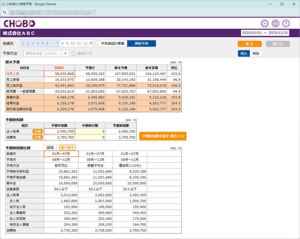 前年対比、移動平均法、増減率指定と3つの予測方法で予測が可能、予想年税額を4つまで保存し比較・シミュレーションできますのでぜひご利用ください。