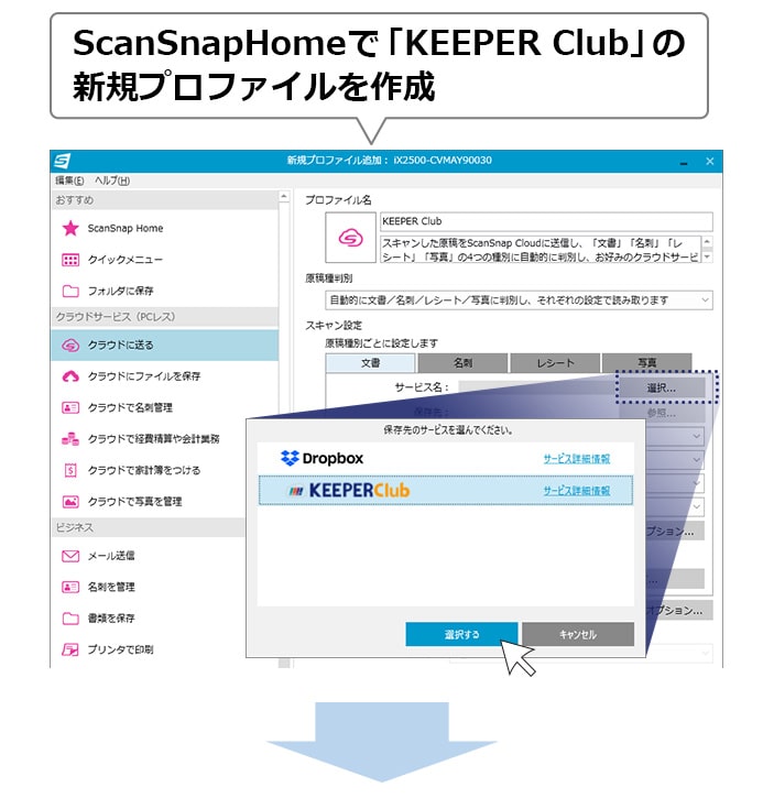 はじめにScanSnapをパソコンに接続してScanSnapHome画面を開き「KEEPER Club」という新規プロファイルを作成しておけば、Wi-Fi環境がある場所からならScanSnapで証憑をスキャンするだけでKiCHOの指定したデータに証憑データが保存されます。