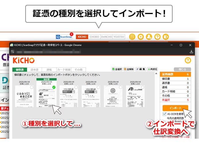 KiCHOに保存された証憑を確認、種別を選択(領収書、請求書、通帳、カード明細、その他)し、インポートすれば複数の証憑を一気に仕訳変換することも可能です。