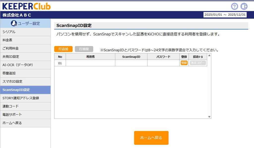 ScanSnapIDは、PFU社のスキャナScanSnapシリーズ(iX2500、iX1600、iX1500、iX1300、iX100)を使ってスキャンした証憑ファイルをKiCHOに送り込む場合に利用する専用IDです。無料で何IDでも作成できます。