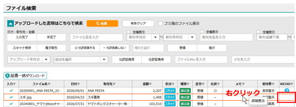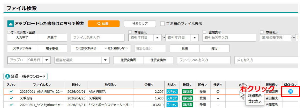 仕訳作成済みの証憑(「KiCHO」欄が「済」の証憑)を右クリックした場合は「詳細表示」「仕訳表示」の2択になります。