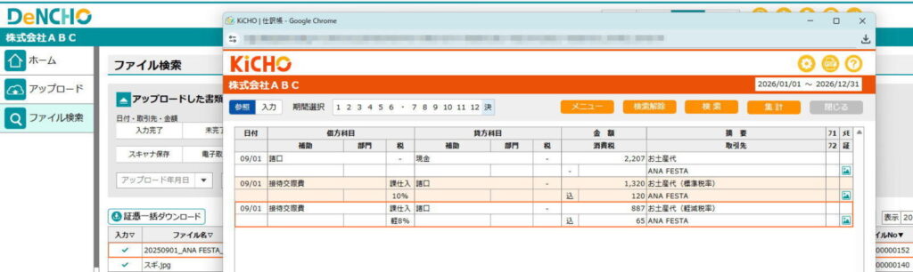 • 証憑右クリックメニューで「仕訳表示」を選択すると、その証憑から作成された仕訳が別ウインドウ(KiCHOの仕訳帳ウインドウ)で開きます。