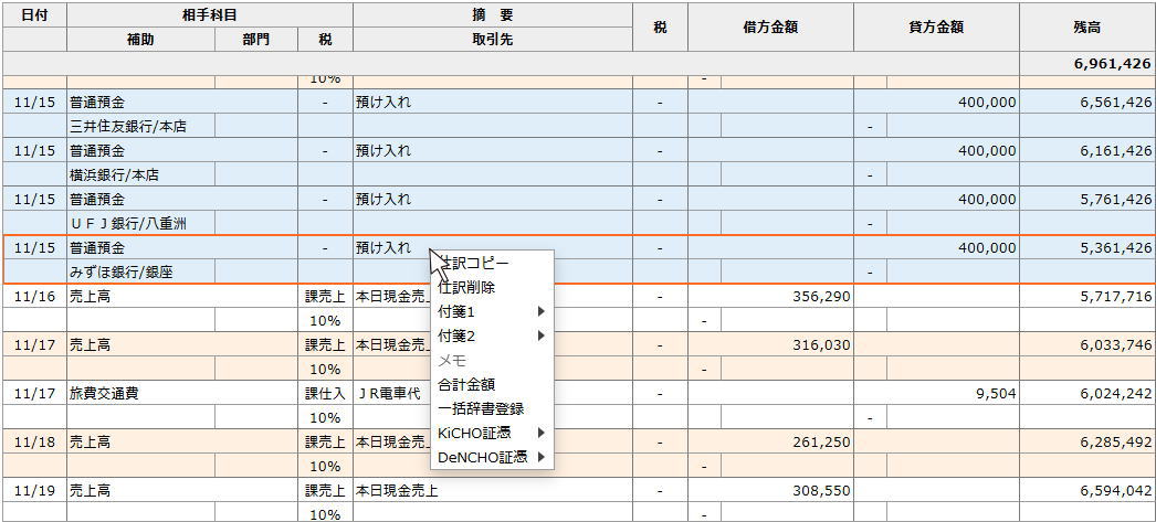 『KiCHO』に取り込んだすべての仕訳を勘定科目ごとに集計し、日付順に表示します。