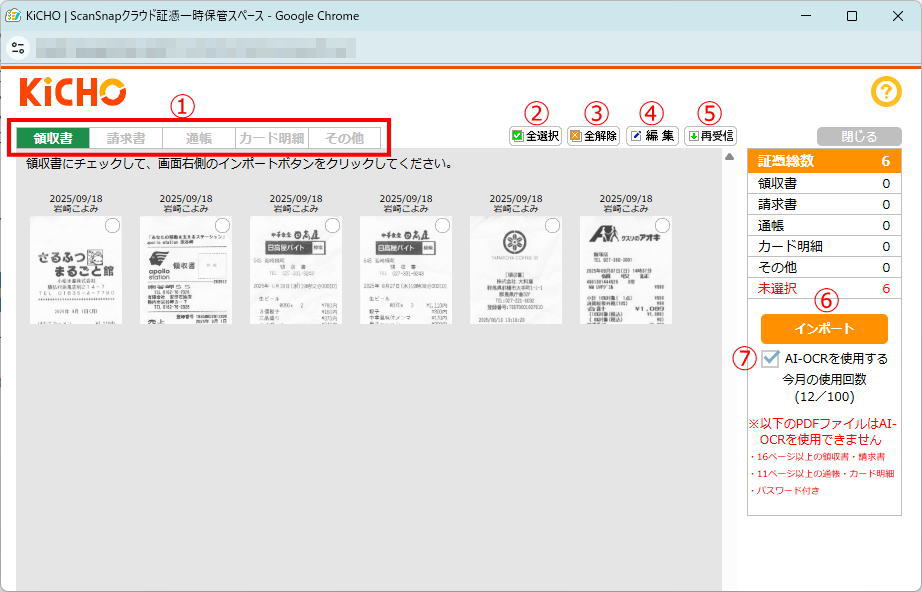 種別を選択した証憑が「証憑仕訳変換>仕訳変換」を経由して仕訳に変換されます。「⑦AI-OCRを使用する」がチェックONの場合、「領収書/請求書」は「日付・金額・取引先(請求先)」を読み取ります。「通帳/カード明細」は「日付・入金額・出金額・残高・摘要(判定)」を読み取ります。「その他」は「⑦AI-OCRを使用する」がチェックONでも読み取りはありません。 |