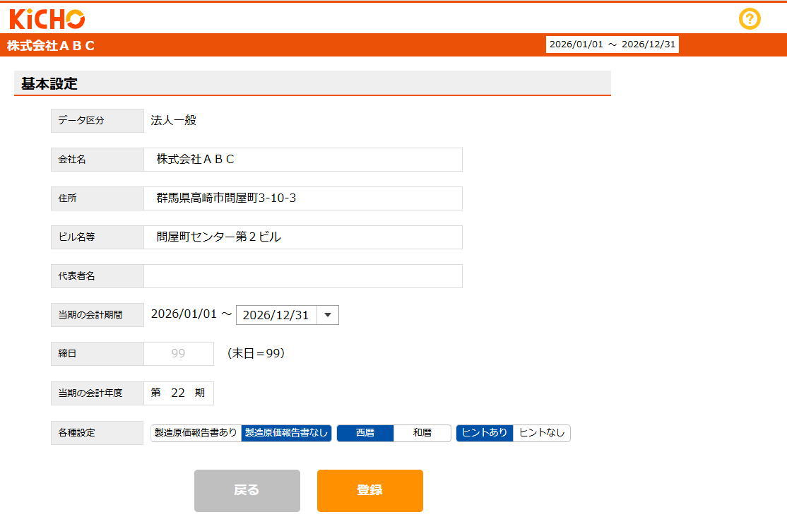 「締日」は「当期の会計期間」が1年未満の場合に変更できます。「1~27」又は「99(末日)」で設定してください。