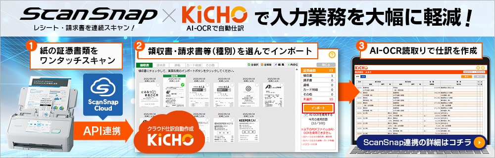 クラウド会計KEEPER ClubのDeNCHOとKiCHOはScanSnap(スキャンスナップ)と連動OK。連続スキャンとAI-OCR(文字情報読取り)で会計業務の効率を大幅にアップします。