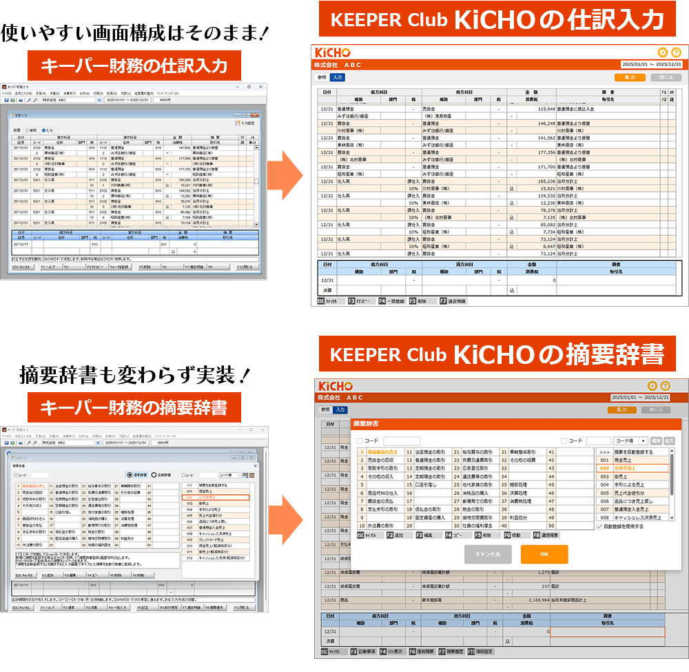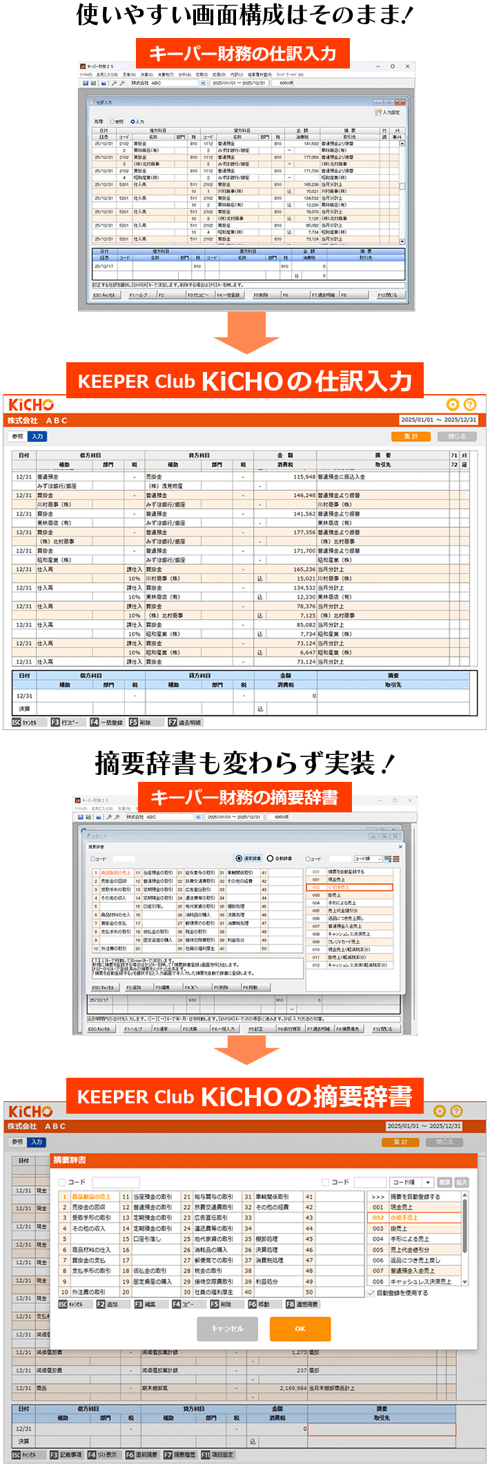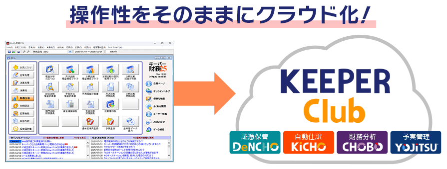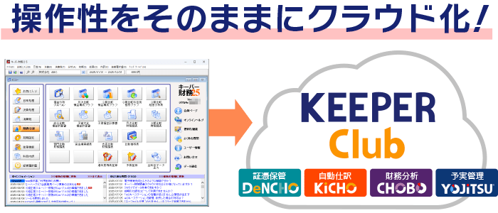 キーパー財務をベースに作られたクラウド会計「KEEPER Club」。入力などの基本画面はほぼ同じ構成なので安心してご利用いただけます。