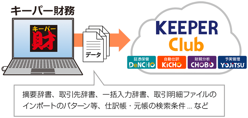 キーパー財務なら API 連携で摘要辞書、取引先辞書、取引明細ファイルのインポートのパターンなどを KEEPER Club に移行した状態でデータ作成が完了します。