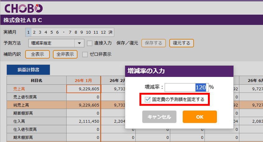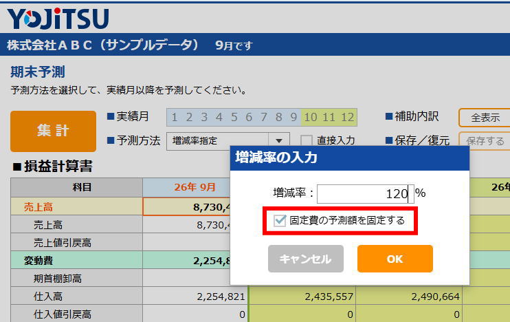 • 「予測方法:増減率」を指定した場合に「固定費の予測額を固定する」が選択できるようになりました。「固定費の予測額を固定する」にチェックすると、売上と変動費を指定した率で予測し、固定費は前年実績と同額が予測値になります。