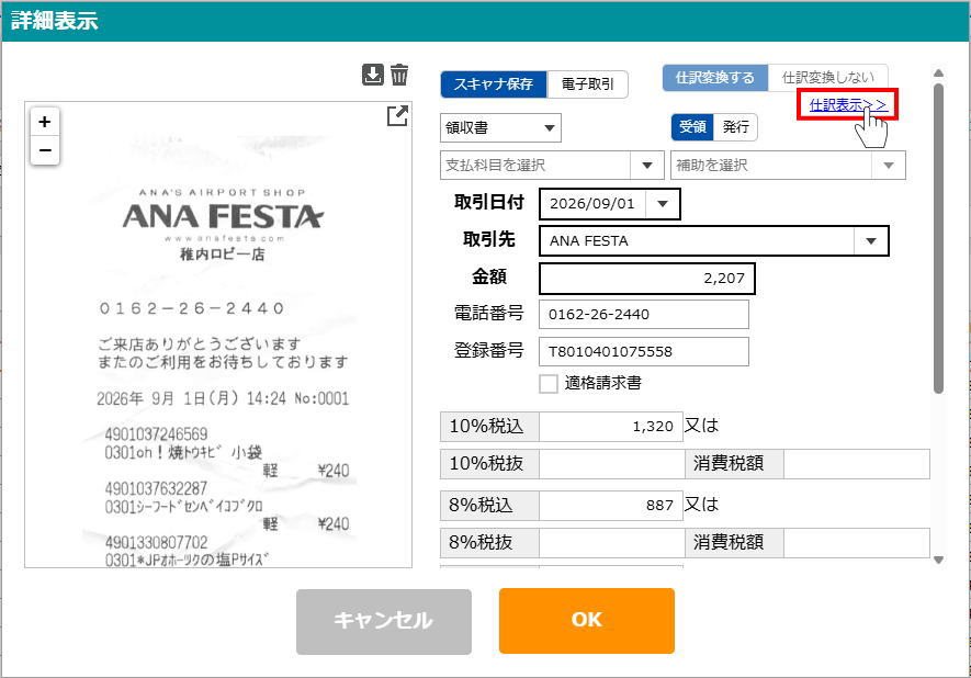 • 仕訳作成済みの証憑(「KiCHO」欄が「済」の証憑)で詳細表示を開いた場合は画面右上に「仕訳表示>>」が表示されます。「仕訳表示>>」をクリックすると、その証憑から作成された仕訳が別ウインドウ(KiCHOの仕訳帳ウインドウ)で開きます。