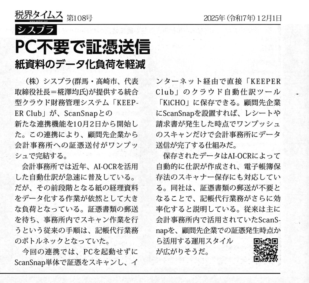 統合型クラウド管理システム「KEEPER Club」について2025年12月1日付の税界タイムスに掲載されました。